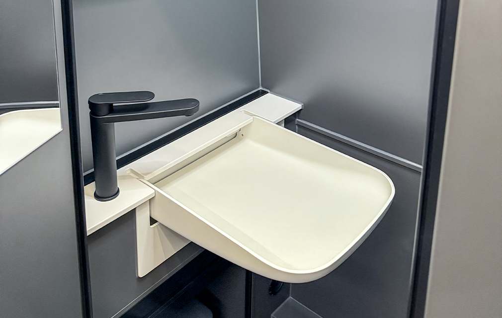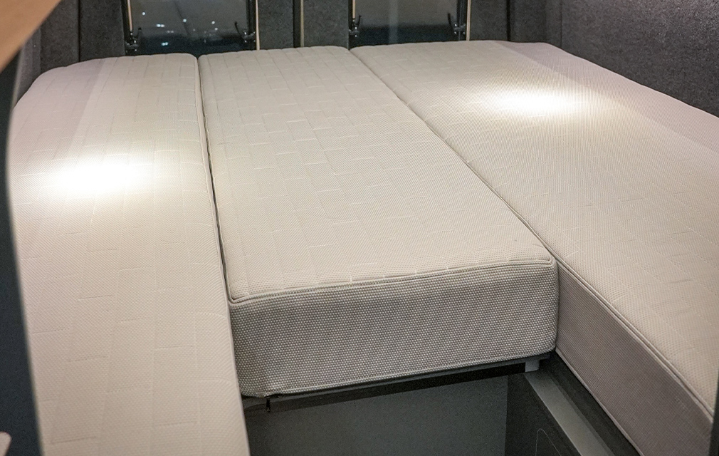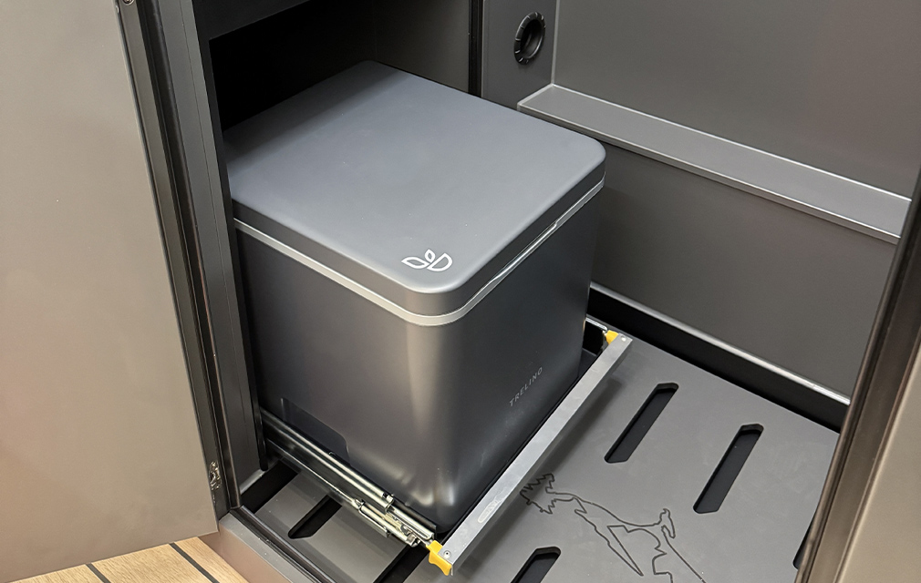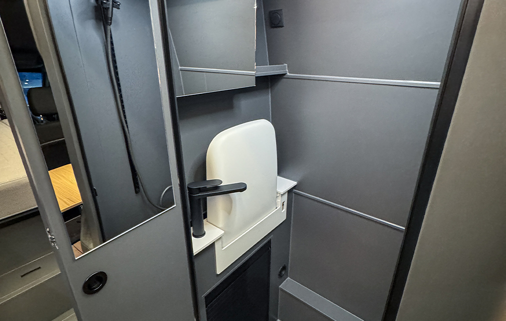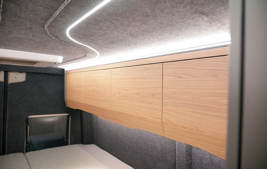Der neueste Camper aus dem Hause RHÖN CAMP. Mit einem komfortablen Längsbett, das über zwei Treppenstufen (die gleichzeitig Stauraum sind) bequem zu erreichen. Viel Stauraum finden Sie in den darüberliegenden Deckenschränken. Basis ist der Mercedes Sprinter 419CDI 7 m mit Heckantrieb. Einen Allradantrieb gibt es natürlich optional.