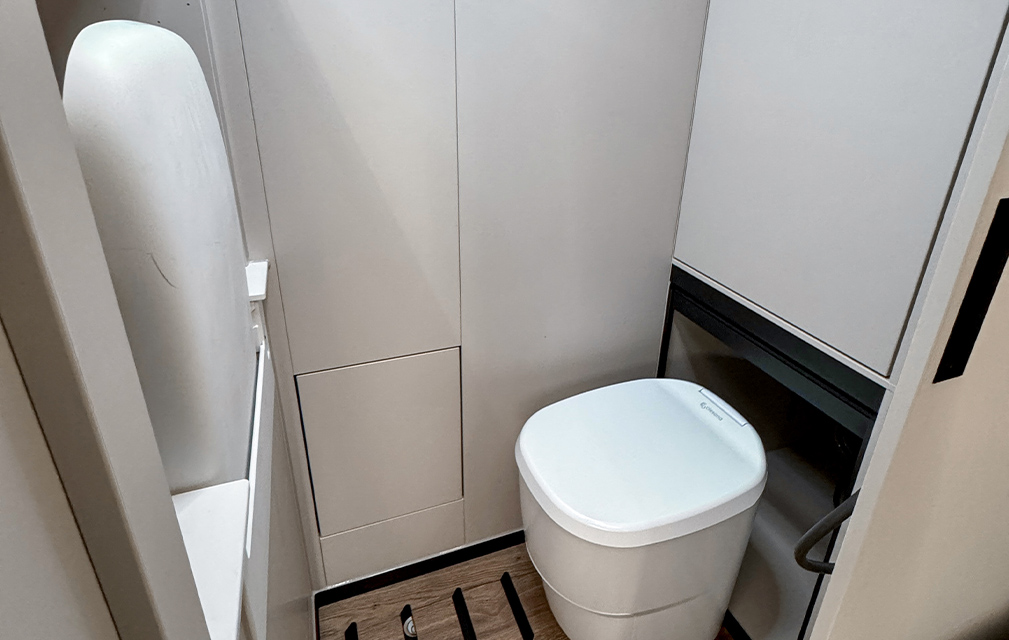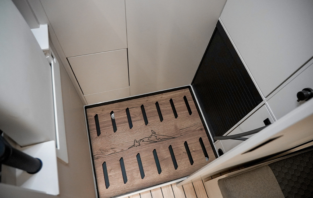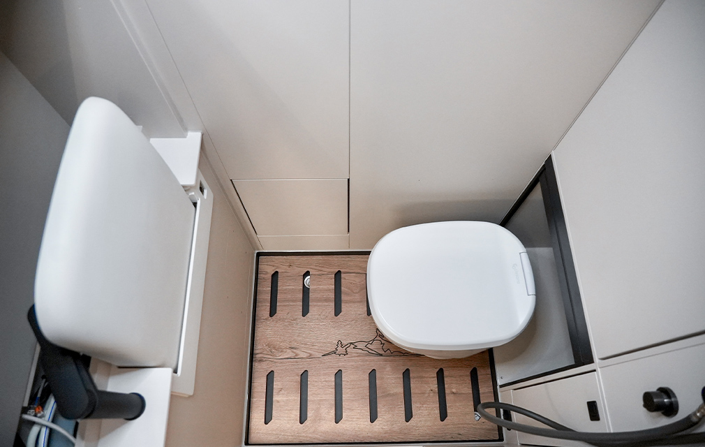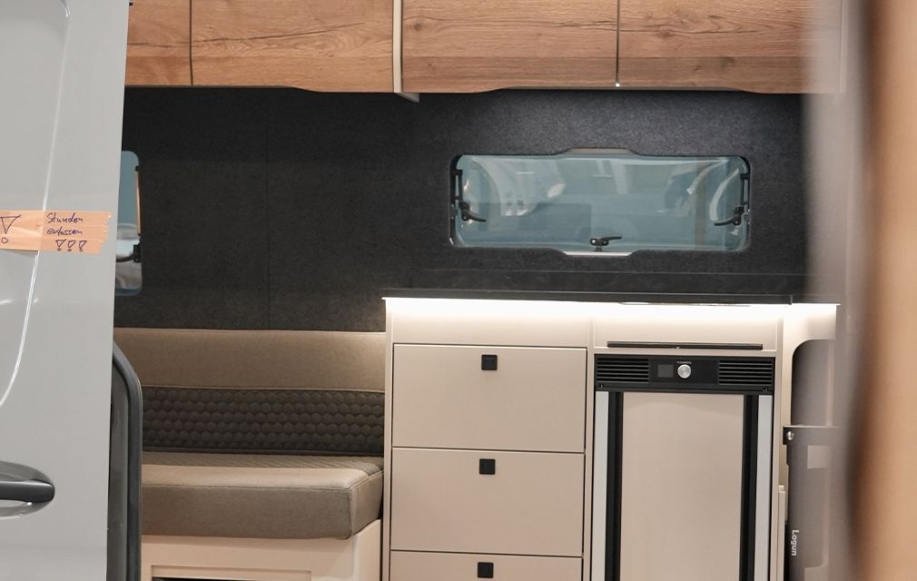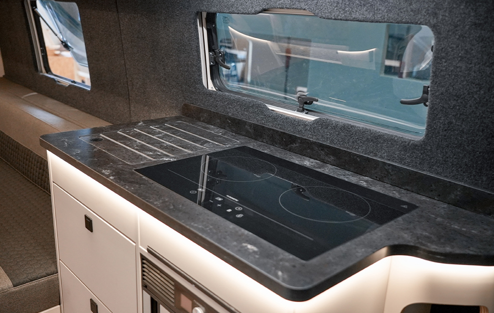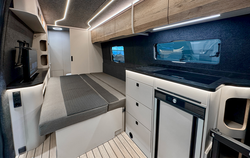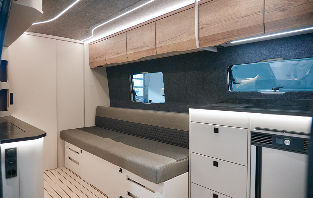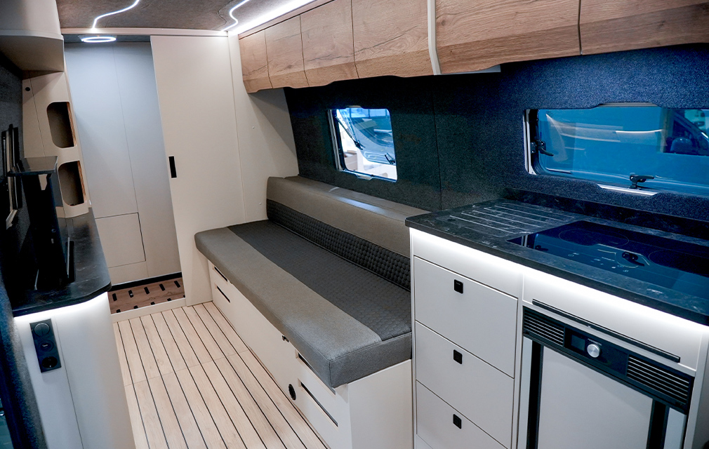 Der Rhön Camp THE SEEKER steht für ein offenes Raumkonzept und modernes Reisen. Auf Sprinter-Basis entwickelt, bildet das ausziehbare Loungesofa mit Schlaffunktion den Mittelpunkt und schafft einen großzügigen, wandelbaren Wohnraum.